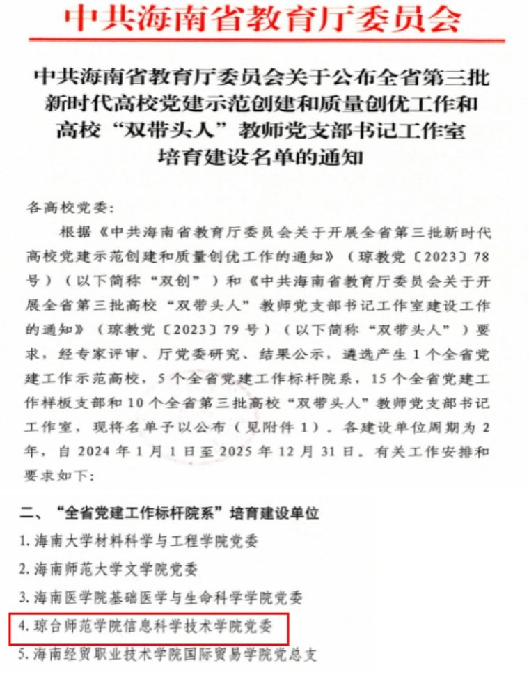 日前, 中共海南省教育厅委员会公布了全省第三批新时代高校党建示范创建和质量创优工作和高校“双带头人”教师党支部书记工作室培育建设名单,琼台师范学院信息科学技术学院党委入选“全省党建工作标杆院系”培育创建单位。
