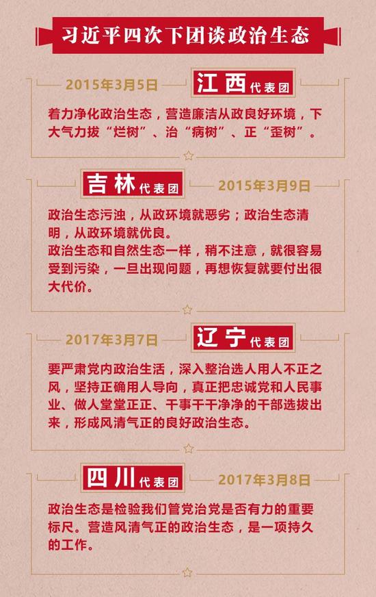 自2015年起,在全国两会下团组时,习近平至少四次谈到政治生态。