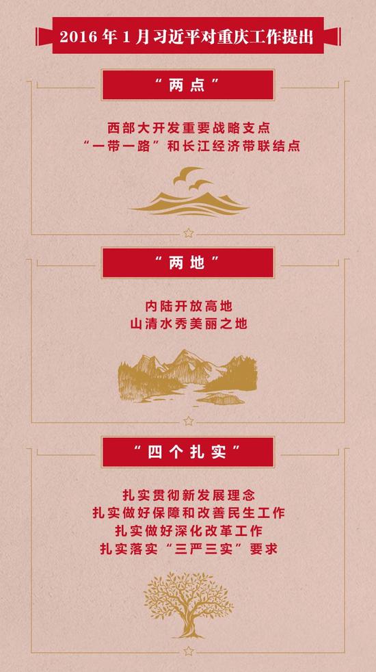 2016年1月,习近平新年的第一次国内考察安排在了重庆。在那次考察中,他对重庆工作提出的要求,后来被归纳为“两点”“两地”和“四个扎实”。