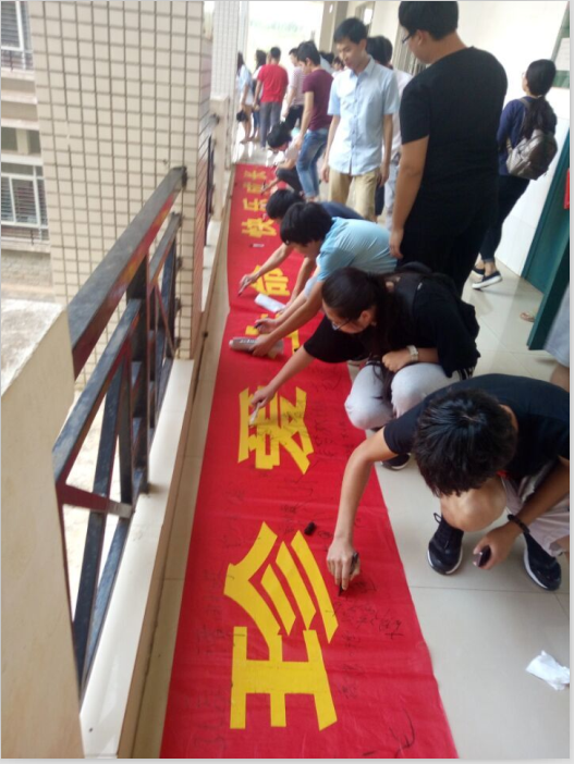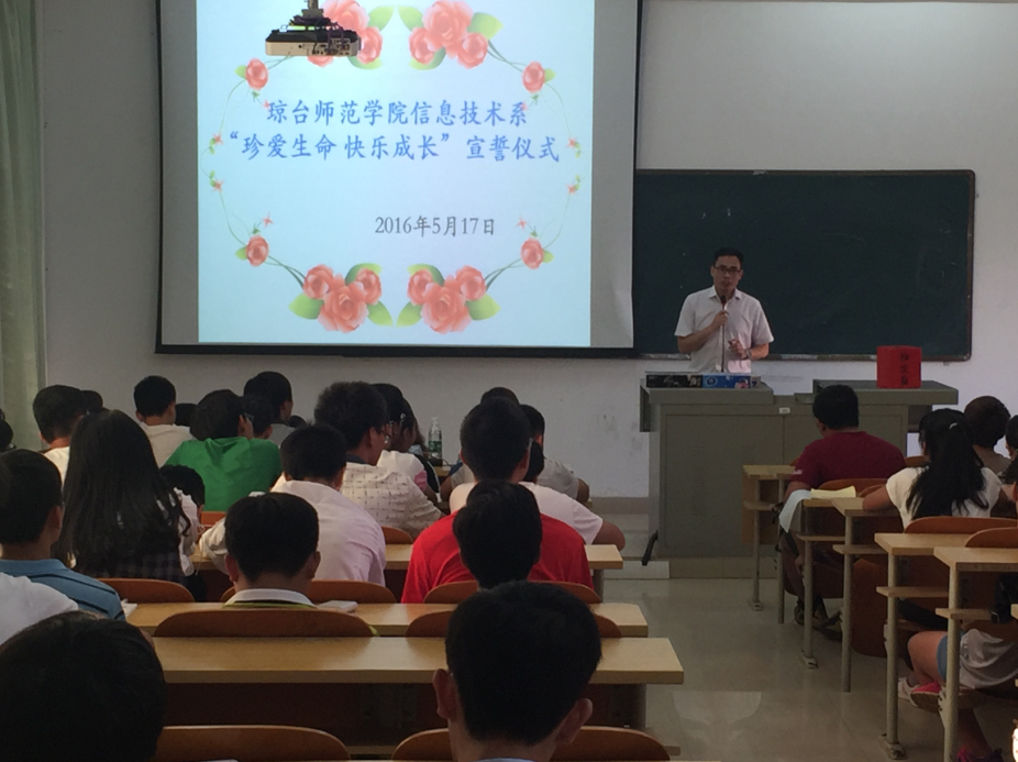 5月25日是全国大学生心理活动日,“525”谐音为“我爱我”。值此我校第十届大学生心理健康活动月之际,为呼吁在校大学生关注心健康,提高心理素质,构建和谐心灵,和谐校园,我系于5月17日下午举行2015级全体学生“珍爱生命快乐成长”宣誓签名仪式。出席仪式的有我系党总支颜松海书记,主管心理健康工作辅导员、国家二级心理咨询师李全华老师以及2015级全体学生。