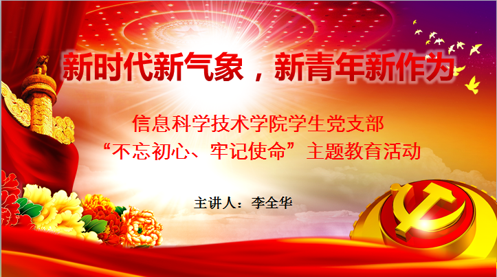 为贯彻落实学校关于深入开展“不忘初心、牢记使命”主题教育的要求,1022日下午,我院学生党支部书记李全华老师为学生党支部全体党员、入党积极分子及发展对象上了一堂题为《新时代新气象 新青年新作为》的党课。
